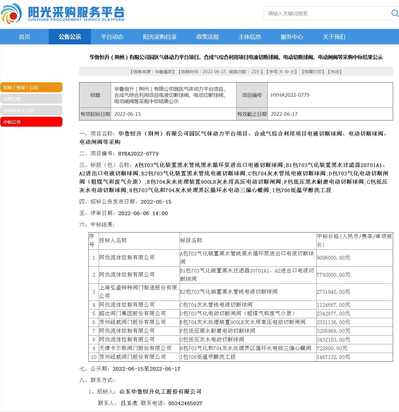 2022年6月份,jinnianhui今年会流体控制有限公司(以下简称AFA公司)在华鲁恒升(荆州)有限公司园区气体动力平台、合成气综合利用项目耐磨球阀采购招标中再获大批订单。