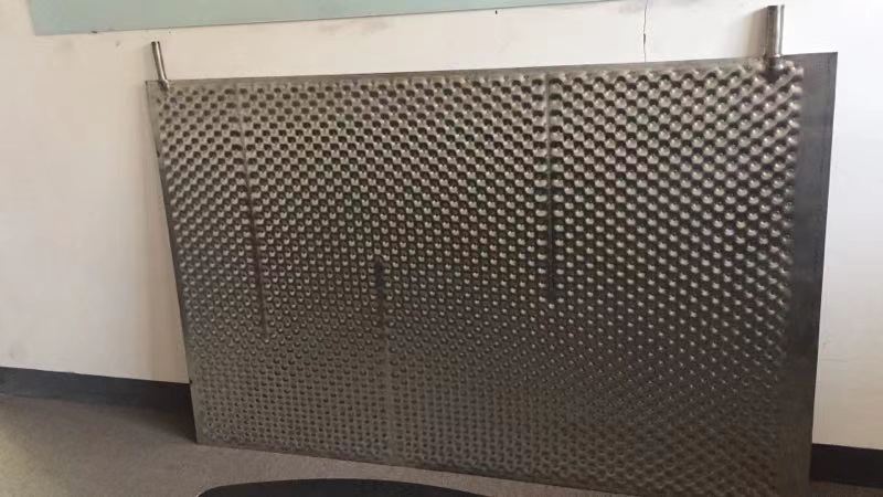 2、在热能采集器中,两种换热介质(中介水与污水)借助水泵的驱动,始终以顺向或反向流动,而且一种换热介质温度是延流动方向升高,另一种换热介质温度延流动的方向降低。由于换热板采用纽扣式波纹且一次冲压成型,使得层与层换向处增加了对换热介质的扰动,两种换热介质始终处于高效换热的紊流状态,温度场的分布也是最均匀的,换热效率高,换热系数高达2336.09W/㎡·K。